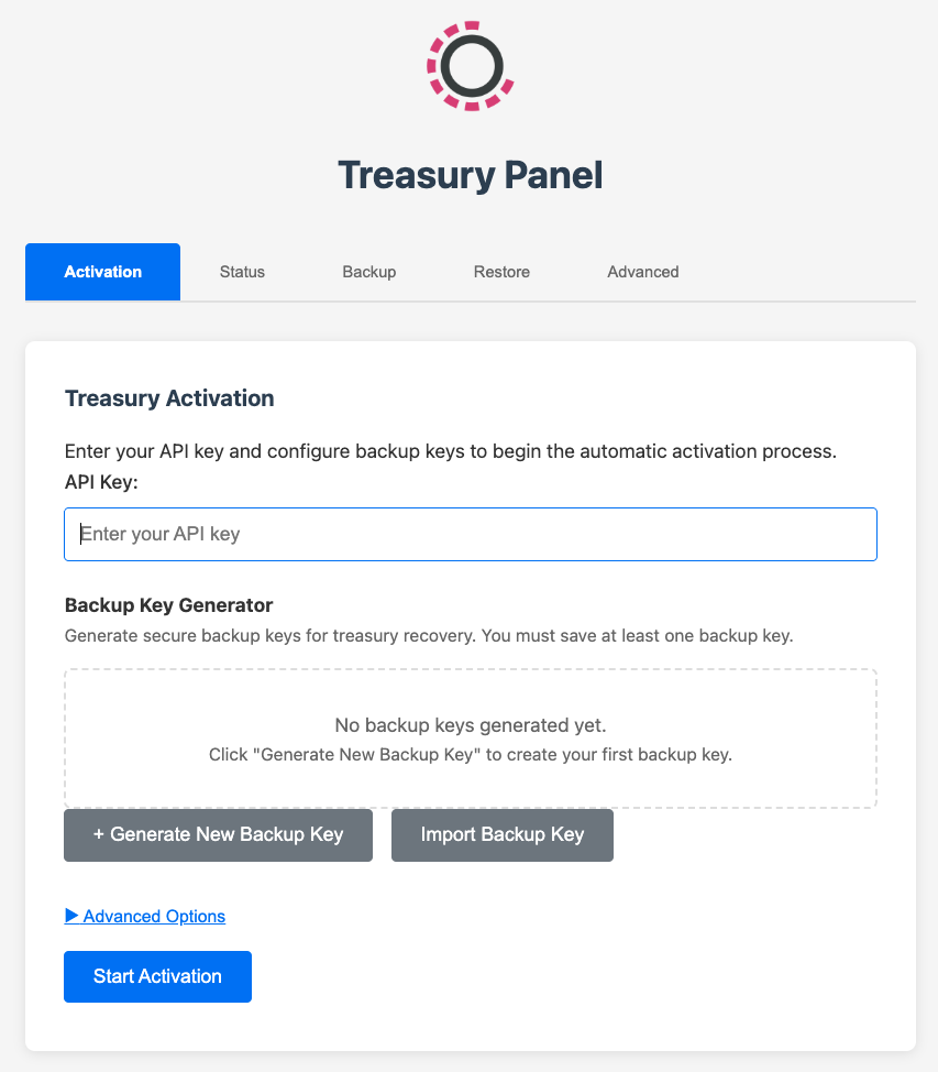 Using the Panel UI, you can now activate your Treasury instance. This securely pairs it with the Treasury node(s) running in Cordial Systems infrastructure.